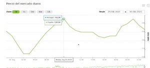 De la misma fuente sacamos el precio del mercado diario con un valor también récord de 132,92 €/Mwh a las 9 de la mañana (Figura 2) que es el que aparece en todos los medios de comunicación.