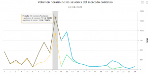 Si en vez del precio nos fijamos en el volumen de compra y venta en las sesiones del mercado continuo, observamos un incremento muy importante a las 10 de la mañana.