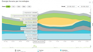 En esta grafica puede observarse que la energía nuclear esta a su máxima capacidad; la eólica representa un porcentaje muy pequeño de su máxima capacidad debido a la ausencia de vientos; la energía solar representa un porcentaje relativamente bajo de su máxima capacidad debido a la hora solar. La energía hidráulica también representa un bajo porcentaje de su capacidad por la situación que se encuentran nuestros pantanos. Si necesitásemos mas capacidad, porque disparase una nuclear, de estas últimas tecnologías no podríamos tirar y habría que recurrir a las centrales de ciclos combinados donde tenemos suficiente capacidad de generación.