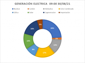 OMIE también nos proporciona datos de energía horaria suministrada por tecnología. Como puede observarse en el gráfico (Figura 4), a las 9 de la mañana del día 30/08/2021 la generación nuclear es de 6938 Mwh y representa la mayor fuente de energía; seguida por los ciclos combinados con 5030 Mwh y la cogeneración 4580 Mwh. Estas dos últimas tecnologías son muy dependientes del gas natural. Se observa que la producción eólica es relativamente baja, lo mismo que la solar (por la hora del día).