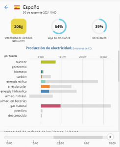 Figura 6 Producción, capacidad y emisiones de CO2 10:00 30/08/21 (Fuente electricitymap)