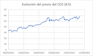 No solo eso, además cuando utilicemos estas tecnologías debemos comprar los derechos de emisión de CO2 que también se están incrementando de manera alarmante. Si en Julio de 2016 el precio estaba en 4,30€/t ahora lo tenemos multiplicado por más de 10 (y subiendo) como puede verse en la siguiente gráfica.